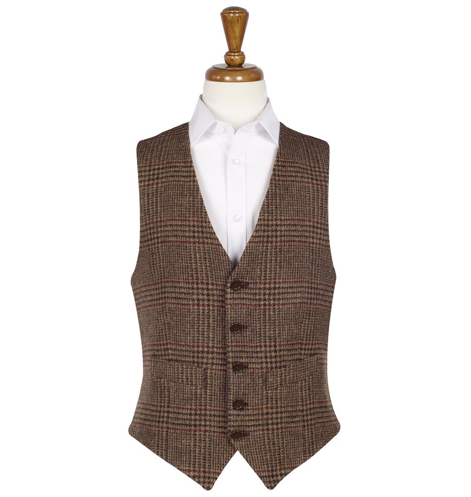 Iain Brown Red is a checked tweed waistcoat from Bucktrout Tailoring. It matches perfectly to jacket Patrick Brown Red and pants Yorkshire Tweed Brown Red. They are made of the same tweed, so they compose a beautiful three-piece suit in combination with the waistcoat. Moreover, model Iain Brown Red looks perfectly with jeans, odd pants and jackets. It would be better, if they are sole-coloured and not too thin. Good choice will be models of flannel, tweed, corduroy and moleskin.